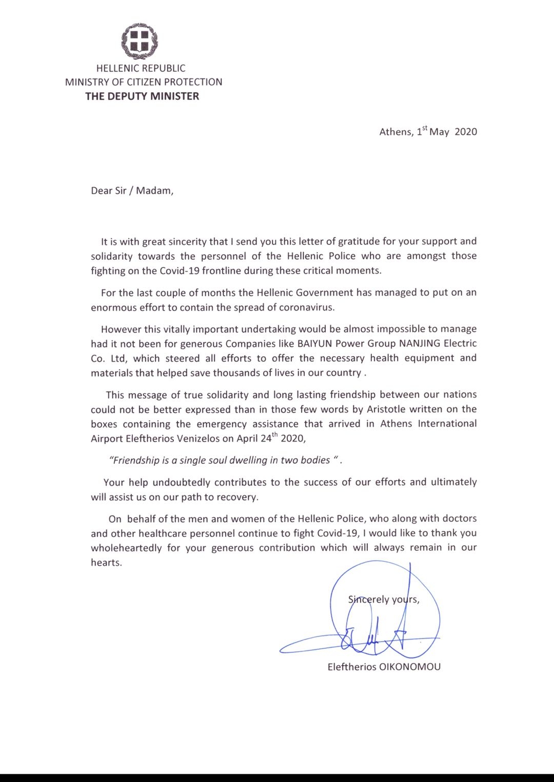 2020年5月1日,希臘共和國公民保護部副部長Eleftherios OIKONOMOU先生于雅典向南京電氣發出感謝信,對南京電氣在新冠肺炎疫情防控中對希臘安全與警察部門及時提供支持幫助表示感謝。 感謝信說,作為在抗擊...