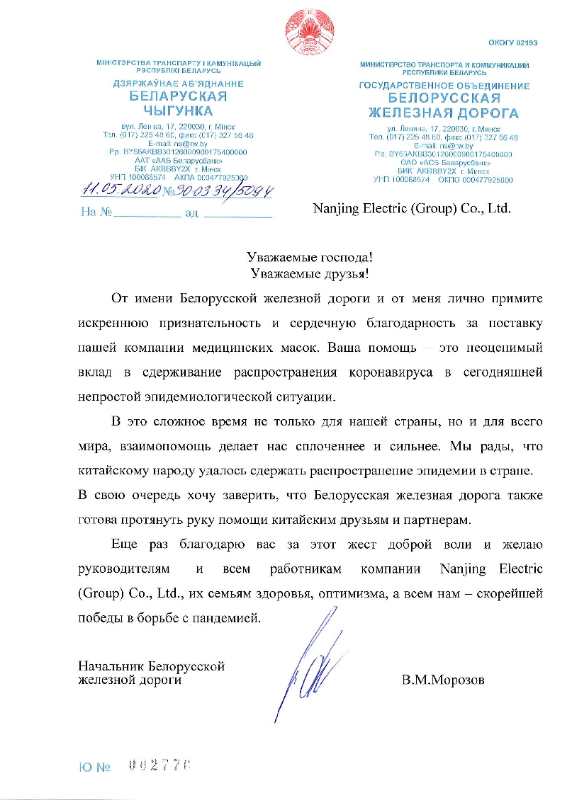 2020年5月11日,白俄羅斯鐵路長官弗拉基米爾•莫洛佐夫先生代表白俄羅斯鐵路部門,向南京電氣發出感謝信,對南京電氣向白俄羅斯鐵路局提供防疫物資支援表示感謝。 感謝信說,在當今疫情防控特殊時期,...